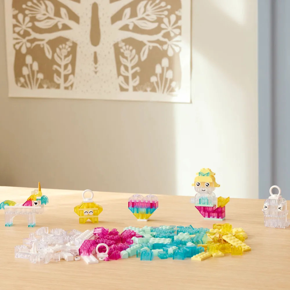 - Kreativt byggesett – gjennomsiktige klosser, øye- og munnelementer og opphengsklosser for utstilling gjør barns kreative kreasjoner ekstra gøyale og glitrende