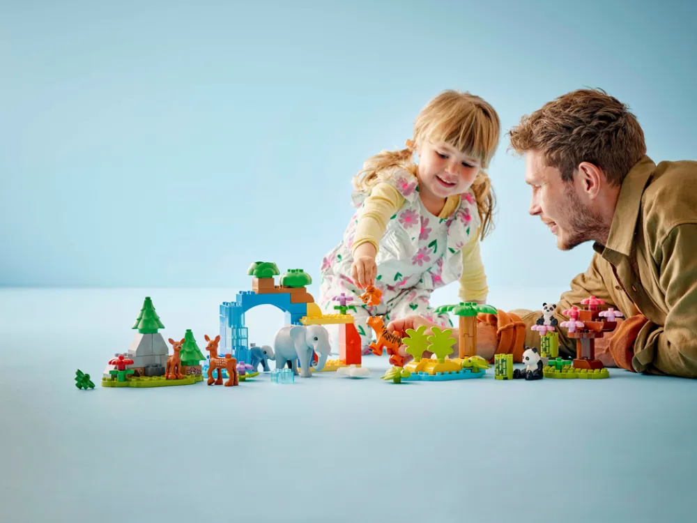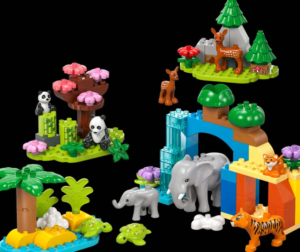 - Fantasivekkende leke med ti ville LEGO® DUPLO® dyr som kan brukes i kreative historier – inkluderer figurer av tiger, elefant, rådyr og panda, hver med sin dyreunge, samt to skilpaddefigurer