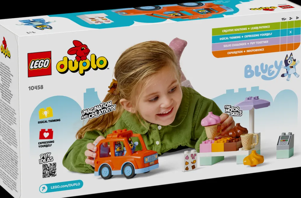La førskolebarn fordype seg i gøyal rollelek med småbarnsleken På iskremtur med Bluey (10458), hvor de kan utfolde seg fantasifull i lek på LEGO® DUPLO® eventyr med et billekesett de kan bruke for å gjenskape scener fra TV-serien Bluey.