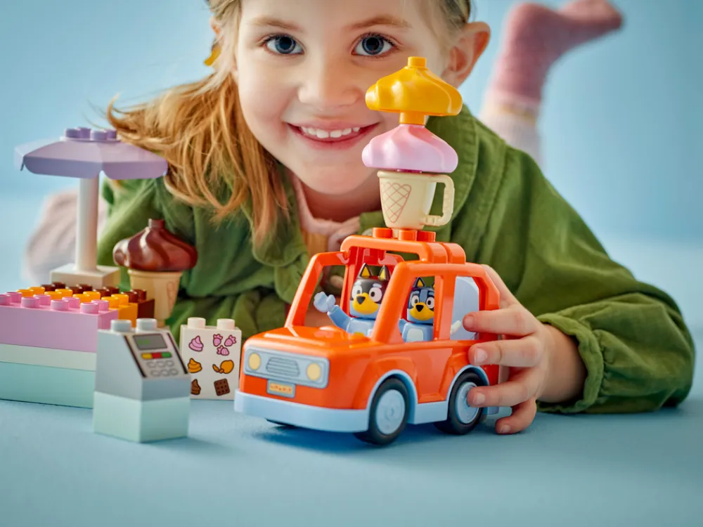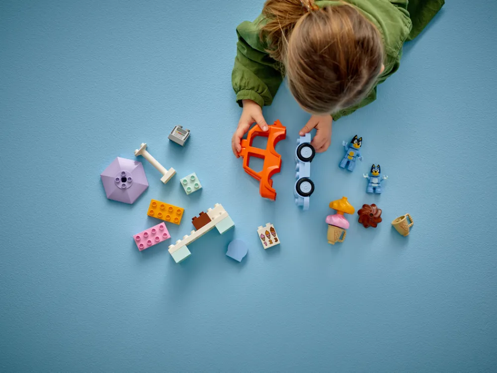 - Lekesett med iskremkiosk og kjøretøy, inspirert av TV-serien Bluey – ta med små barn til Heeler-familiens gøyale verden med småbarnlekesettet LEGO® DUPLO® På iskremtur med Bluey