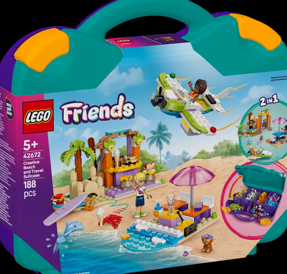 - Byggbar leke – lekesettet Kreativ reise- og strandkoffert for jenter og gutter inkluderer tre modeller som barn kan bygge om til nye scener, to minidukker, en hundefigur og en delfinfigur