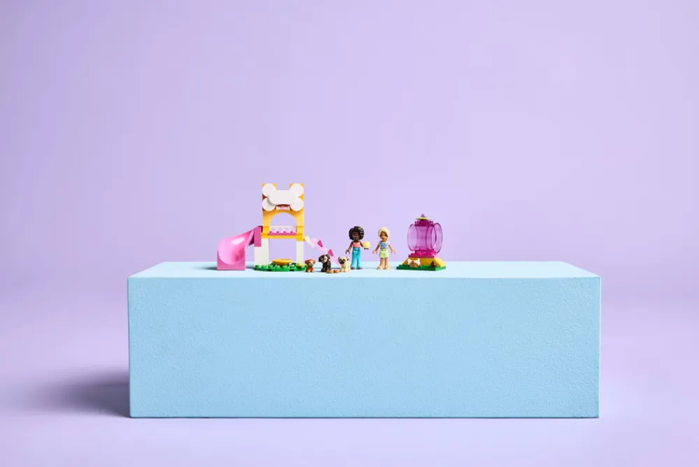 - To LEGO® Friends minidukker og tre hundefigurer – settet inkluderer minidukker av Aliya og Sara samt figurer av valpene Aira, Dango og Maple, som barn kan bruke når de finner på sosiale situasjoner og vennskapshistorier