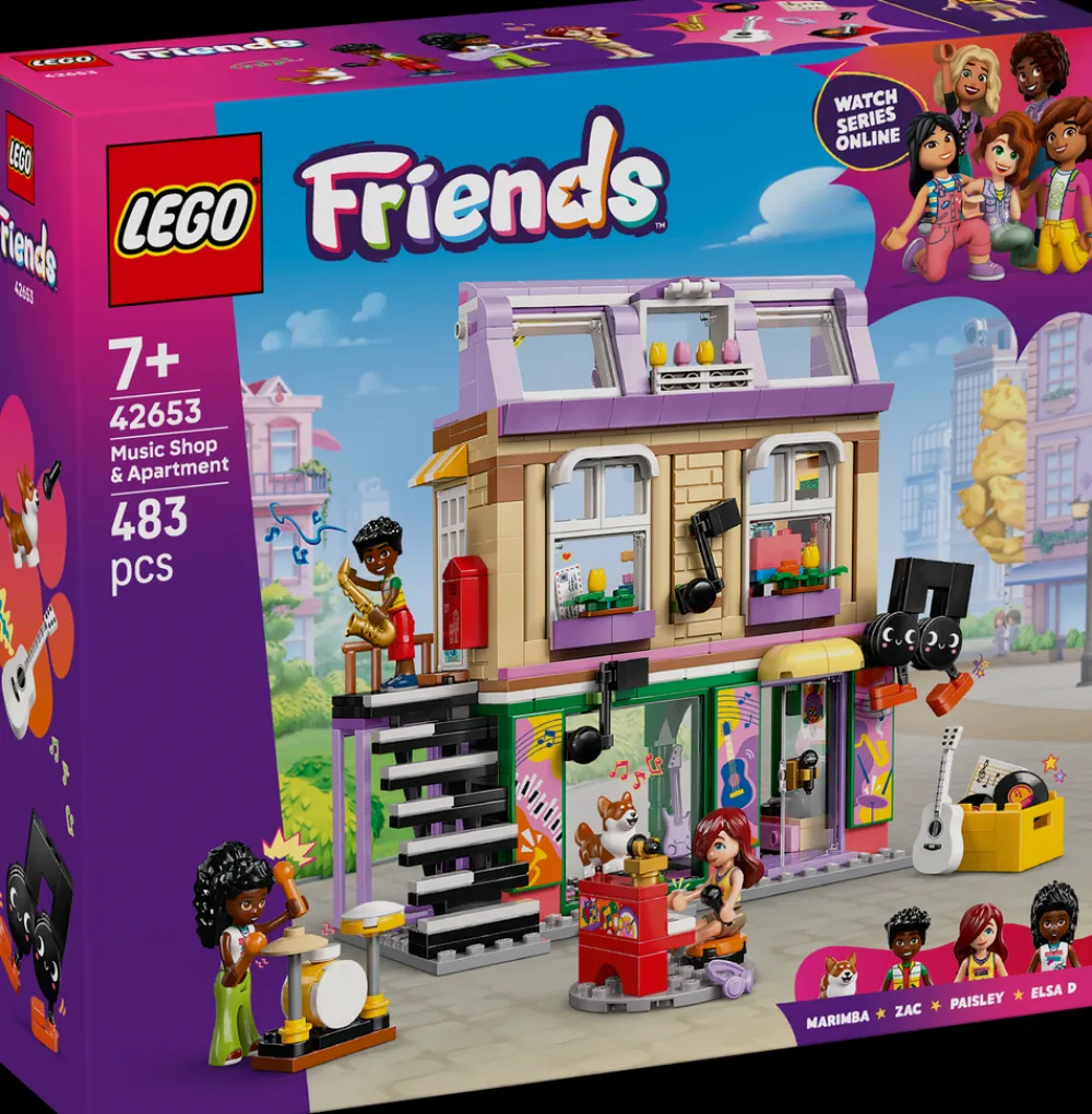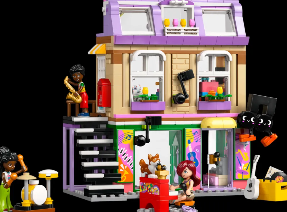- Byggesettgave til musikkelskere – settet LEGO® Friends Musikkbutikk og leilighet inneholder masse musikk-tilbehør, inkludert trommesett, piano, gitar saksofon og mer
