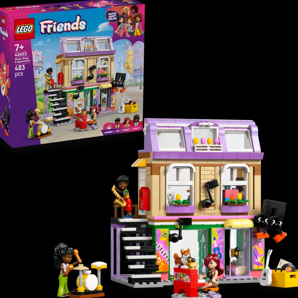 Treff de høye tonene med dette byggbare musikksettet. LEGO® Friends Musikkbutikk og leilighet (42653) er et sett som passer for jenter, gutter og musikkelskere fra sju år og inneholder tre LEGO Friends minidukker, en corgi-figur og fantasistimulerende tilbehør.