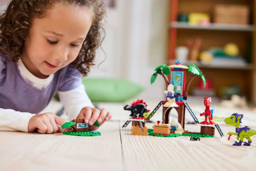 - Eventyr i en LEGO® trehytte – barn kan finne på gøyale helte-, skurke- og dinosaureventyr med Trapster, Ghost-Spider, Gobby-Raptor, Spidey-Rex, Dino-Spin og Trace-E i jungeltrehytta