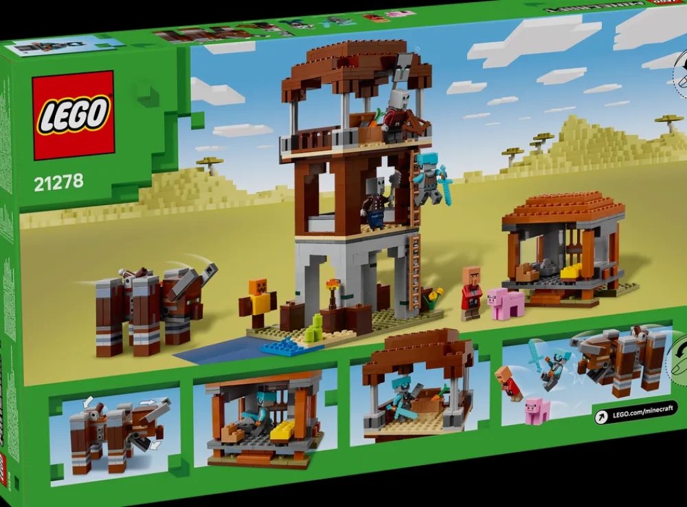 Settet inneholder fire LEGO Minecraft minifigurer: vaktpost, raidkaptein, murer-landsbyboer og en hevner. En spakbetjent kjevefunksjon gjør at barn kan få det byggbare, olme beistet til å glefse og stange. Inkluderer også et vakttårn i tre etasjer med stiger for atkomst, bannere med ansiktet av røvere på og en kiste med verdifullt bytte. Murerens hus har dør som kan åpnes, og er møblert med en seng og en steinkutter. Det er også en LEGO Minecraft figur av en gris og tilbehør, inkludert en treningsdukke, fakkel, gulrot, jernbarre, diamanthjelm, diamantsverd, armbrøst og jernøks. Med LEGO Builder appen kan barn bruke enheten sin til å zoome inn på og rotere modeller i 3D. Inneholder 665 deler.