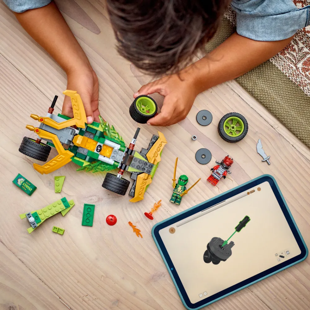 Denne late som-byggeleken inkluderer to NINJAGO minifigurer som barn kan lage spennende rollelek-kamper med: Lloyd med to gylne katanasverd, og en skurkaktig dragonkriger med sverd. Byggesettet inkluderer også to lynelementer som barn kan lage en liten hinderløype med for racerbilen.