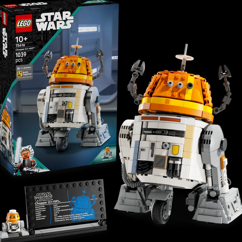 Med denne byggbare LEGO® Star Wars™ lekemodellen (75416) kan barn bygge en gøyal utstillingsmodell av den populære astromech-droiden Chopper (C1-10P). Den realistisk detaljerte byggefiguren av Chopper fra Star Wars: Ahsoka™ passer som søt bursdags- eller julegave til jenter, gutter og fans fra ti år. De kan bevege spaken på ryggen for å aktivere Choppers ikoniske hodebevegelser, plassere armene og bena hans i ulike positurer, felle ut et verktøy fra brystet hans og mer. Choppers armer og midtre hjul kan tas av, slik at det ser ut som om de har blitt trukket inn i kroppen hans.