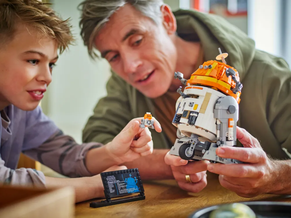 - Byggbart utstillingssett – den byggbare hovedfiguren kommer med en sokkel med informasjonsplate og plass til en LEGO® droidefigur av Chopper (C1-10P) i standardstørrelse