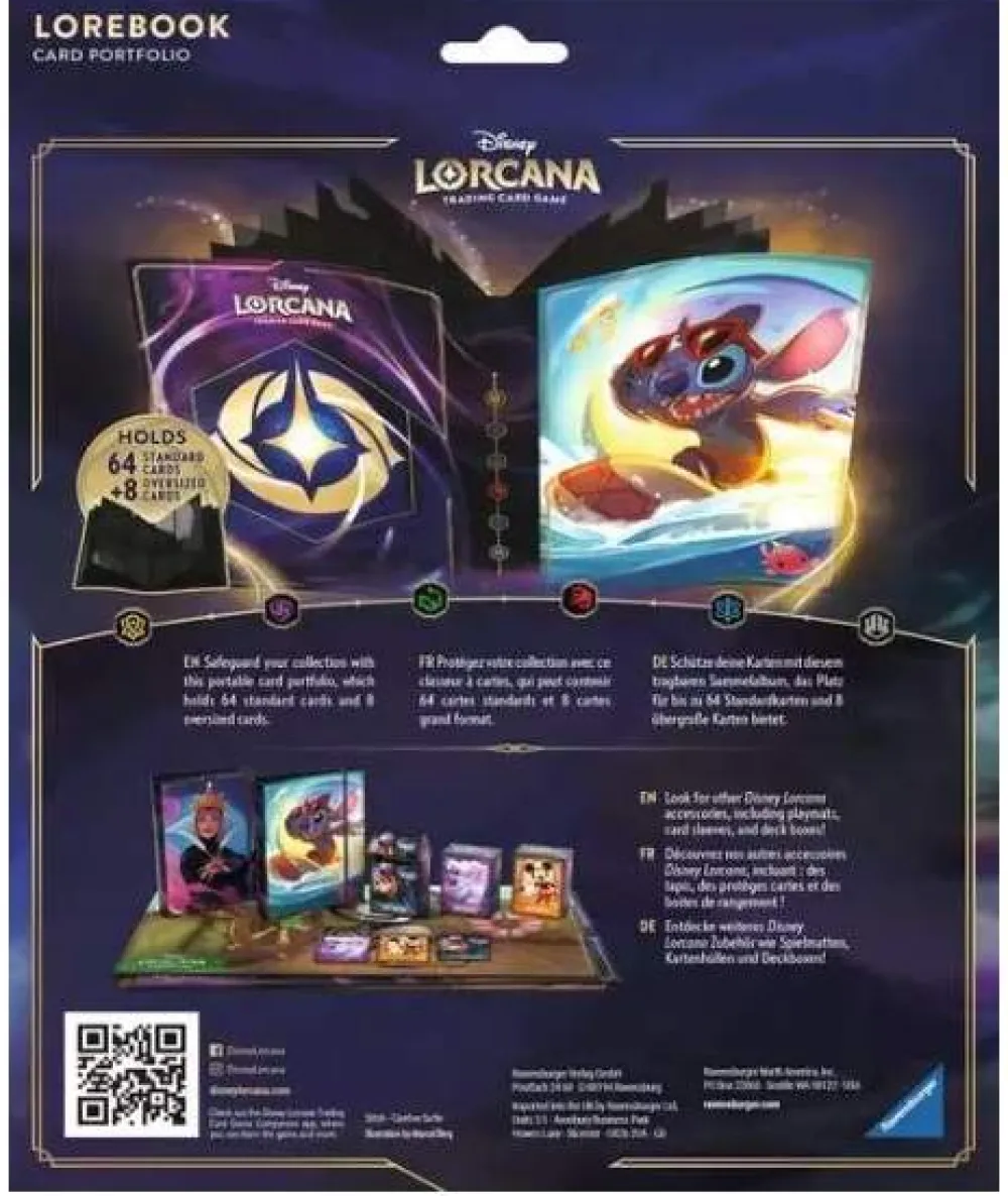 Store cards for quick reference and easy access for trading with this 10-page portfolio featuring card art of Stitch from Disney Lorcana: The First Chapter. Each portfolio can hold up to 64 standard-sized cards and 8 oversized cards.