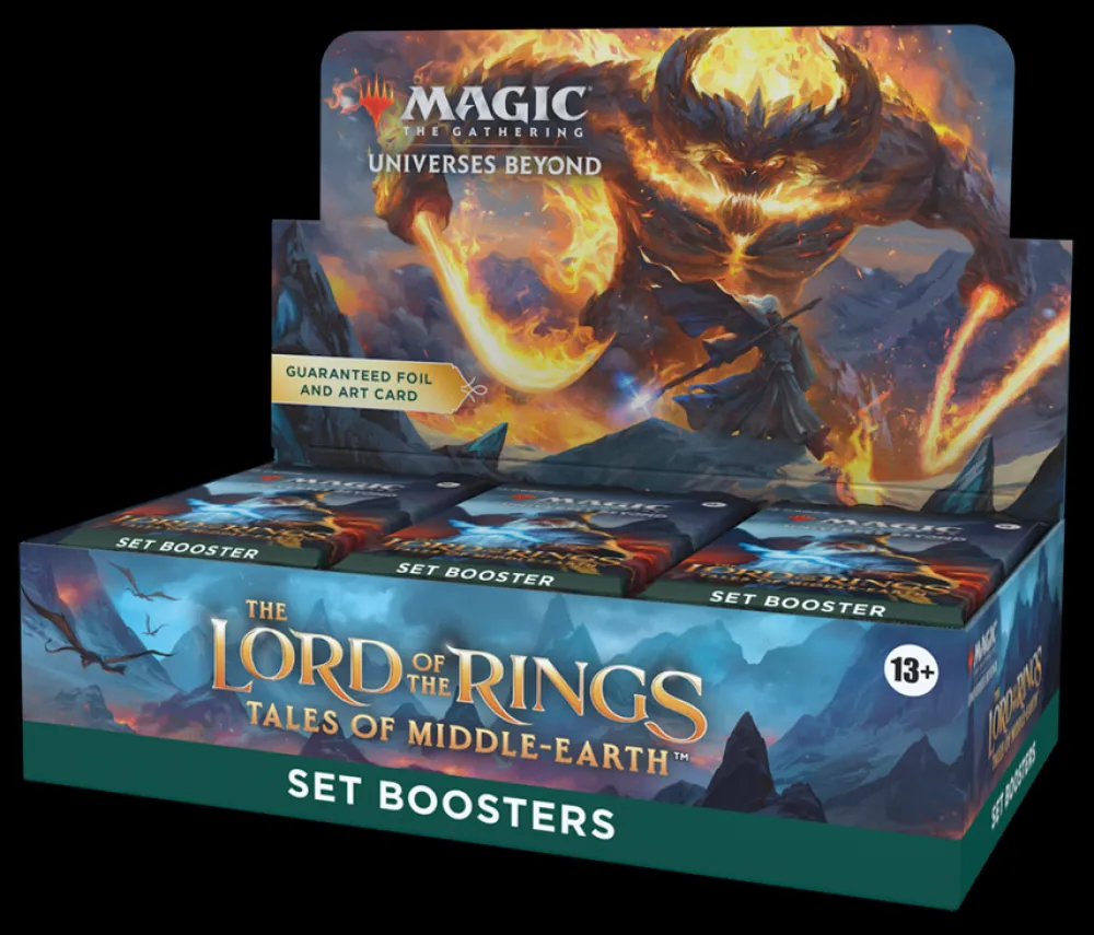 The Lord of the Rings: Tales of Middle-earth Set Booster Box contains 30 The Lord of the Rings: Tales of Middle-earth Set Boosters and 1 Traditional Foil Box Topper card. Each Set Booster contains 12 Magic cards, 1 Art Card, and 1 token/ad card, Helper card, or card from “The List” (a special card from Magic’s history—found in 25% of packs).