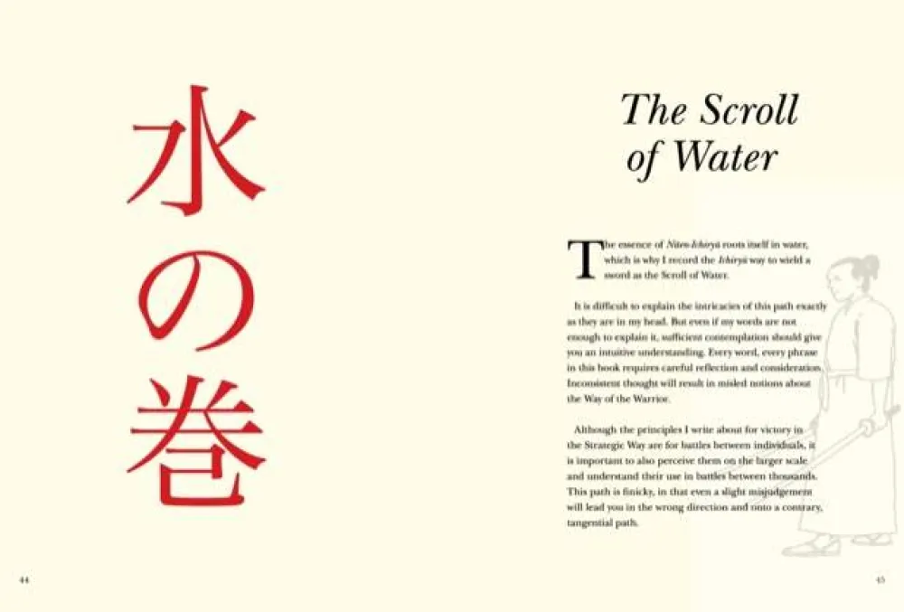 Musashi’s no-nonsense approach to the martial arts and combat includes eliminating technical flourishes, understanding that technique should simply be understood as defeating your opponent, and appreciating that the same qualities apply in both small-scale and large-scale conflicts. Repeatedly, he stresses the importance of learning through practice, rather than mere theoretical learning.