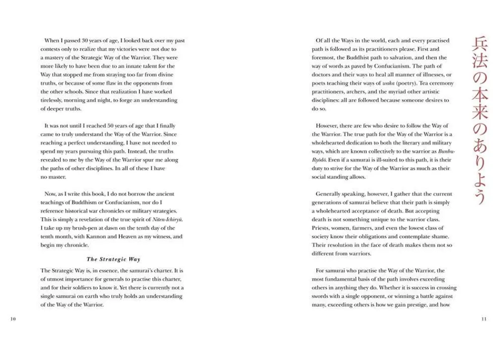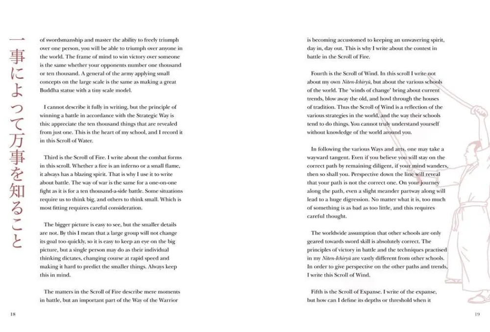 Musashi’s no-nonsense approach to the martial arts and combat includes eliminating technical flourishes, understanding that technique should simply be understood as defeating your opponent, and appreciating that the same qualities apply in both small- scale and large-scale conflicts. Repeatedly, he stresses the importance of learning through practice, rather than merely reading about them.
