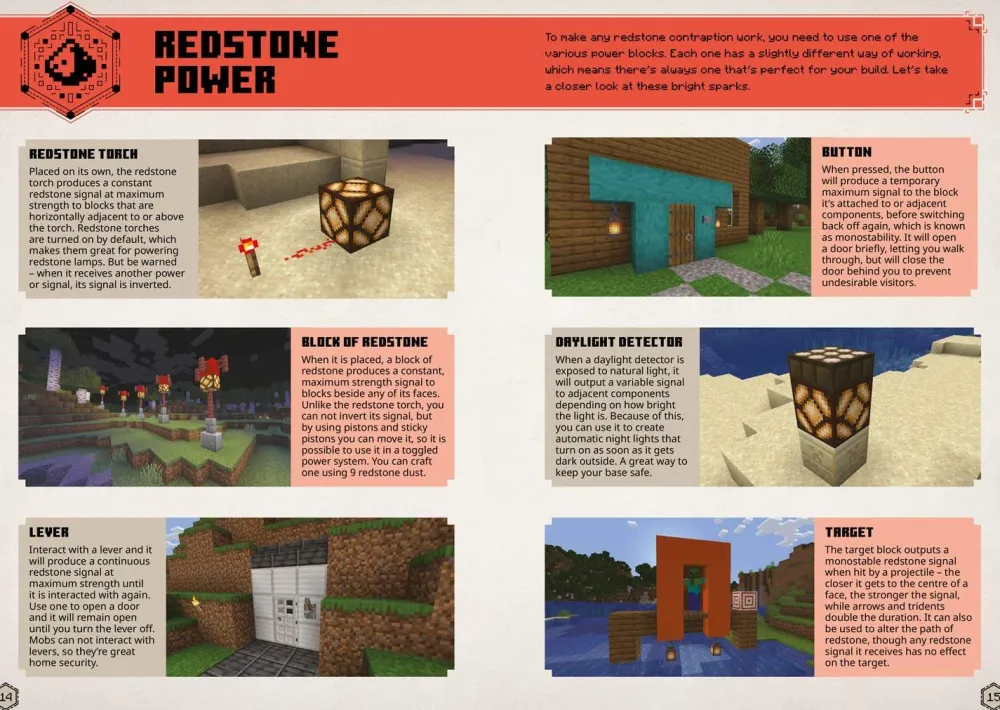 Med trinnvise instruksjoner for å bygge redstone-feller og pilkastere, vil du aldri mer frykte slyngplanter. Blant de tekniske bragdene som er med i denne håndboken, finner du en superstoppeklokke som kan registrere tid til en tidels sekund og Zombie-siege, et morsomt kampminispill bygget med redstone-kretsløp. Disse fellesskapsskapelsene vil inspirere deg til å bygge med rødstein.