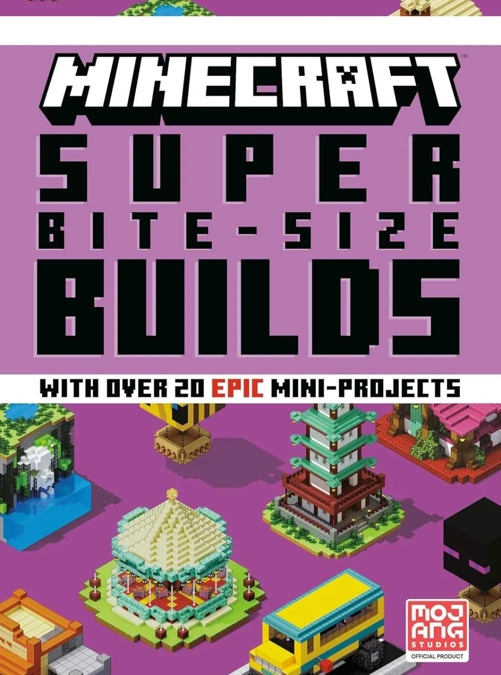 Super Bite-Size Builds: It’s time for another bite-size adventure! Build over 20 more mini-projects in Minecraft, from pig hot-air balloons and carousels to monster-truck school buses and skull coves! There’s even a giant grandfather clock that dispenses chickens!