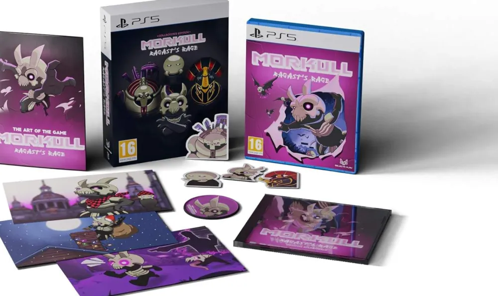 Morkull Ragast’s Rage Collector’s Edition contains: Standard Edition game, an illustrated box, artbook, Morkull’s fabric patch, postcard set, sticker collection, and OST CD!