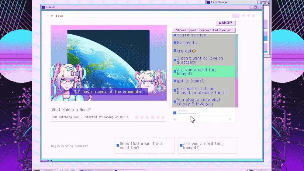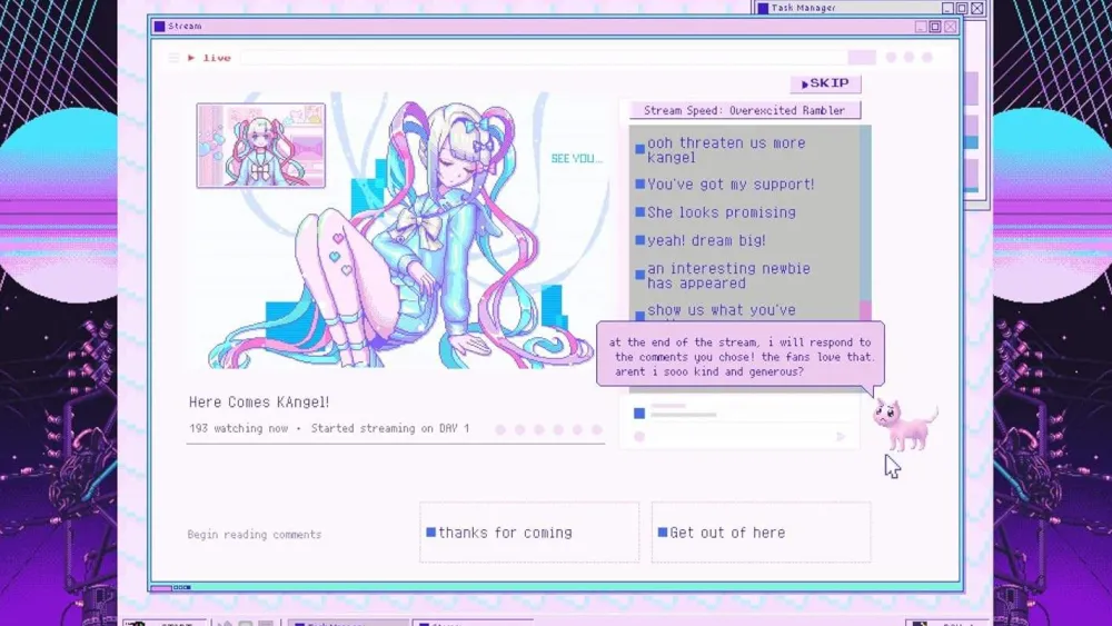 NEEDY STREAMER OVERLOAD is a “multi-ending ADV” depicting daily life with “OMGkawaiiAngel”, a young girl with a rather extreme need for approval attempting to become the #1 “Internet Angel” (streamer).