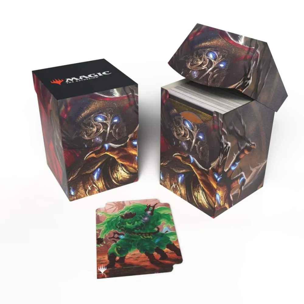 100+ Deck Boxes for Magic: The Gathering feature a vibrant, full-color artwork and includes a deck divider. Made with archival-safe, non-PVC, rigid polypropylene materials, you can store up to 100 double-sleeved cards with confidence. The self-locking lid keeps your cards securely stored when not in use, while also offering easy access. Sized for standard size trading cards.
