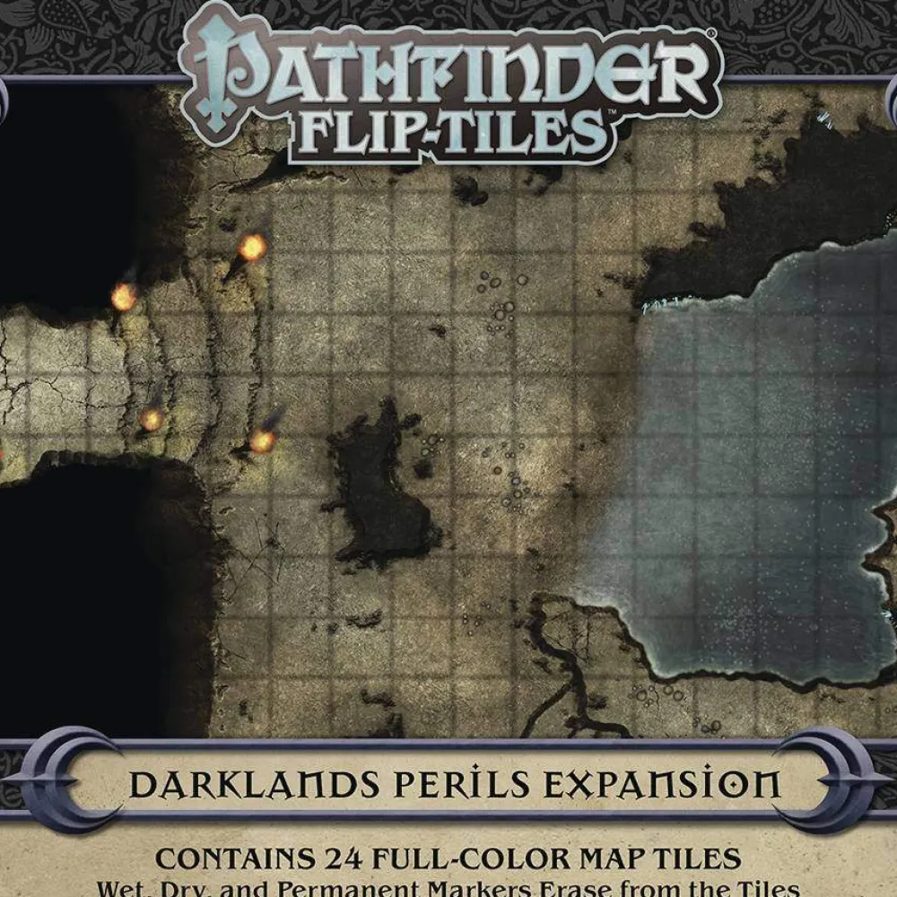 There are dangers in the Darklands that defy reason or imagination! Flip-Tiles: Darklands Perils Expansion is the newest expansion to Flip-Tiles: Darklands Starter Set. With 24 full-color 6 x 6-inch double-sided tiles, each stunningly crafted by cartographer Jason A. Engle, you can spelunk precarious pitfalls, balance atop falling stalagmite bridges, and brave molten chambers. All perfect for the next time the heroes delve deeper into the twisting passages under the earth!