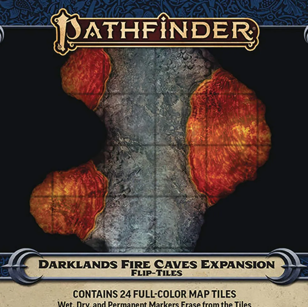 There’s an entire sprawling world of adventure below your feet! Flip-Tiles: Darklands Fire Caves Expansion is the newest expansion to Flip-Tiles: Darklands Starter Set. With 24 full-color 6 x 6-inch double-sided tiles, each stunningly crafted by cartographer Jason A. Engle, you can navigate twisting tunnels, brave bubbling rivers of magma, or explore the lava tubes twisting below a volcanic mountain range. All perfect for the next time the heroes wander too deeply into the depths!