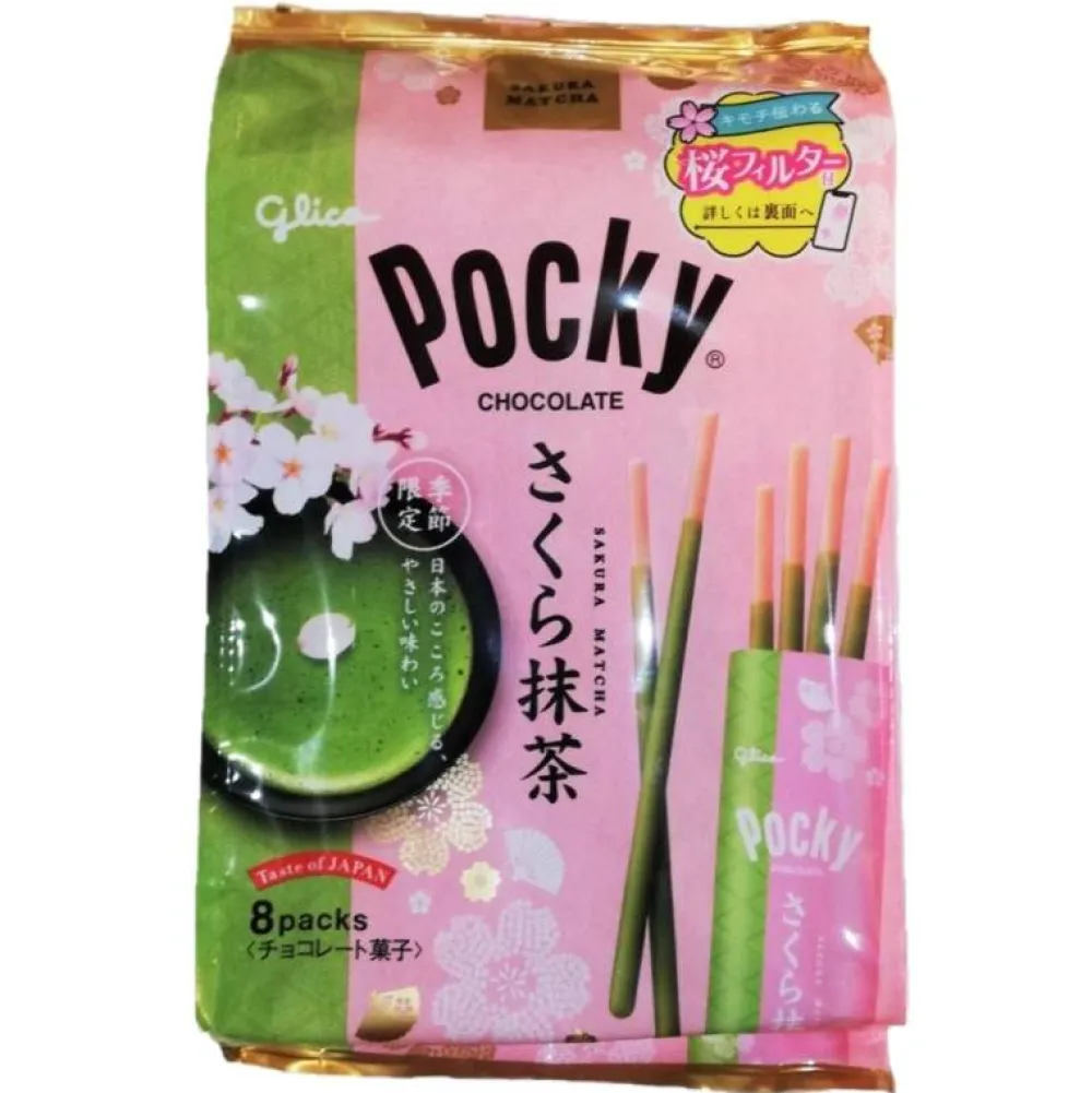 Pocky Chocolate Sakura Matcha er en av de mest populære sesongbaserte Pocky smakene i Japan. Hvert år blir den tilgjengelig til kirebærblomstringen på våren. Sjokoladen er tilsatt matcha og kjeksen er smaksatt med kirsebærblomst ekstrakt, for en deilig kombinasjon av søtt og umami. Denne multipakken inneholder 8 pakker og er perfekt til en piknik under kirsebærtrærne. 101.6g