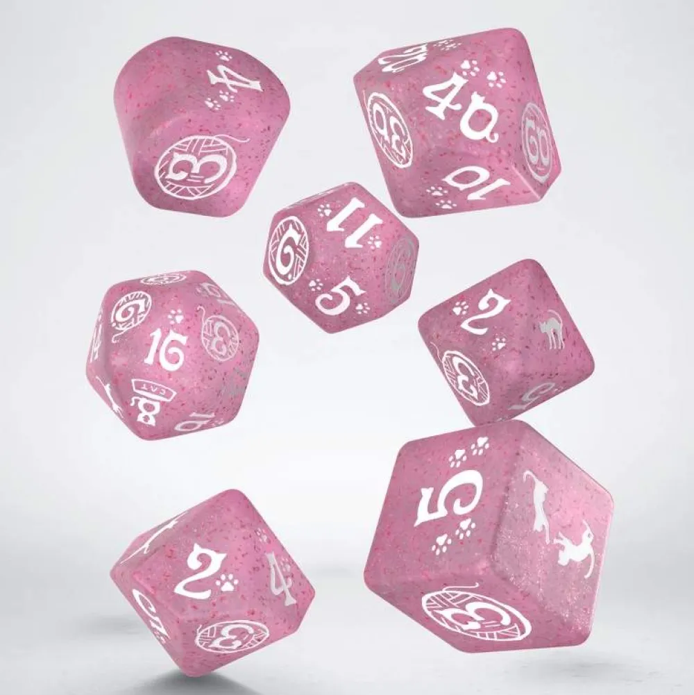 The most fluffy of furs! Q WORKSHOP presents the never-before-seen CATS Dice Set: Daisy. This totally new design shows playful cats and their everyday activities! Each of the 7 dice has different felines posing on the highest face. The shimmering-pink material and white paintings bring about cats’ soft fur, which simply begs to be petted. Give them attention, and they’ll make it worthwhile!