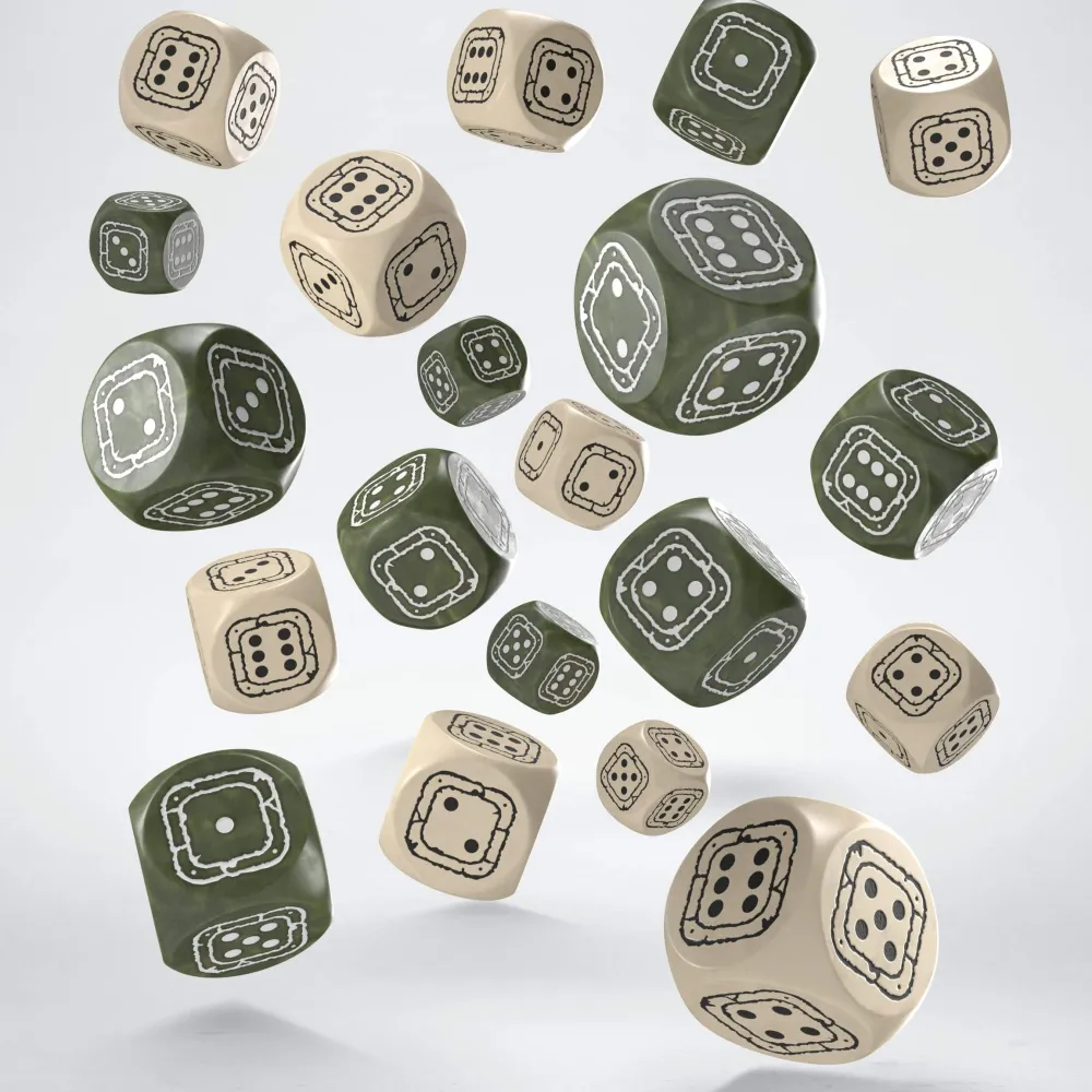 When the game calls, you’re prepared! Here’s something handy: the Fortress Compact D6, a pack of 20 dice divided into groups by distinctive color themes. One is beige with black engravings, and the other is olive with white. All the D6 share the size of 14mm in diameter and the design – the reinforced wall frame with the classic dots inside of it. Perfect for any game, anytime, anywhere!