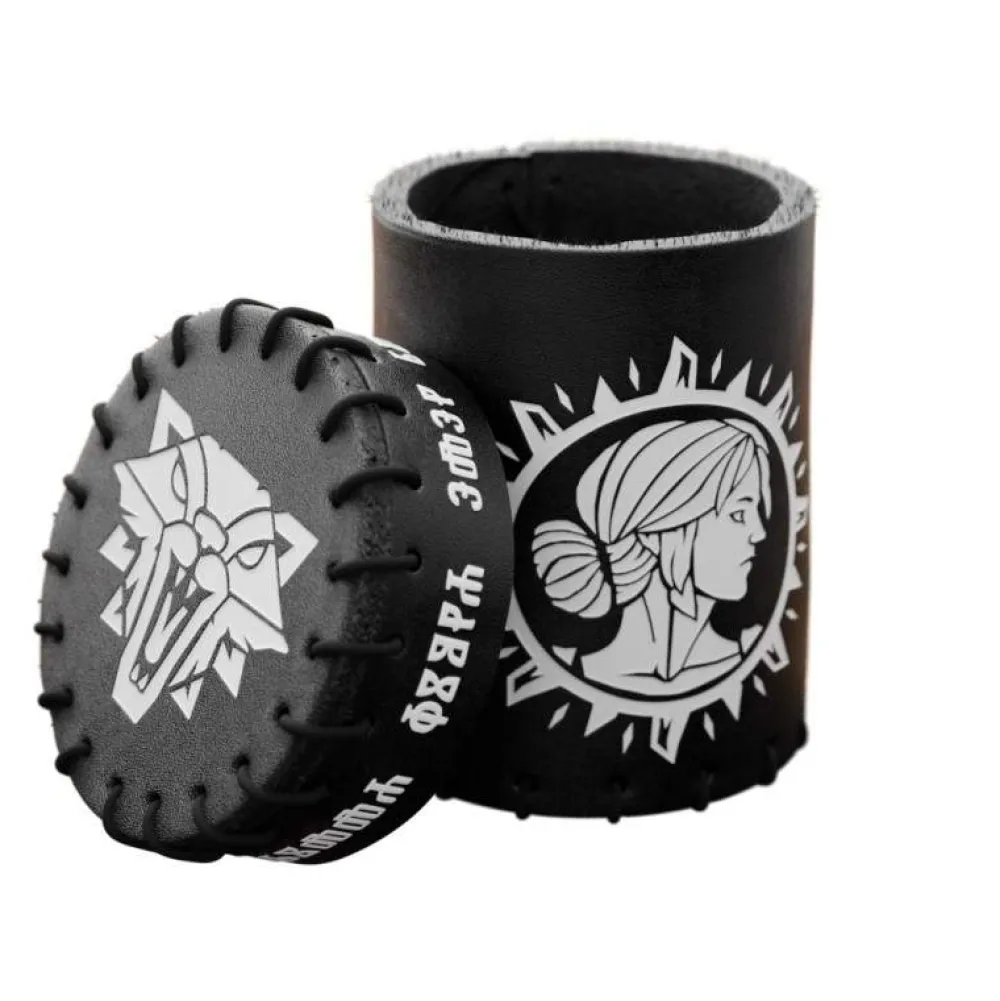 Deadly finesse. This dice cup, inspired by The Witcher universe, presents Ciri, who seemed to dance during a swordfight. Capable of holding up to 20 dice, the cup is made of genuine leather, colored black with embossed white artwork. Atop the lid rests a School of Cat symbol, Nilfgaardian runes saying “Cirilla Fiona Elen Riannon” adorn the perimeter, while the cup’s body bears Ciri’s side-profile.