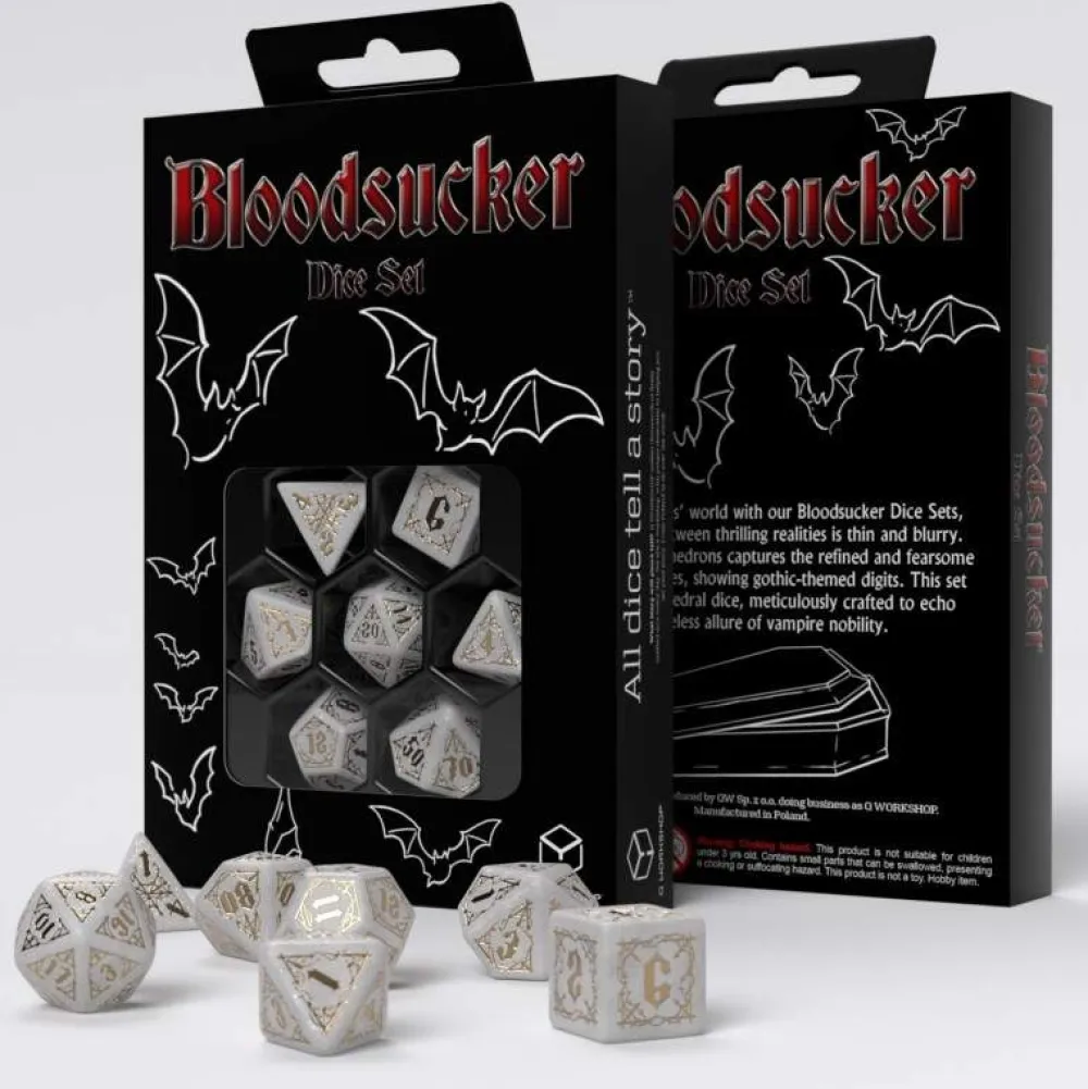 From the depths of ancient crypts and the shadows of forgotten tombs emerges the Bloodsucker Dice Set: Immortal, a weapon imbued with the power of eternal life. The shimmering white dice, adorned with golden embellishments worthy of the most powerful vampire houses, make this set an indispensable piece of equipment for anyone seeking to wield the infinite power of the undead.