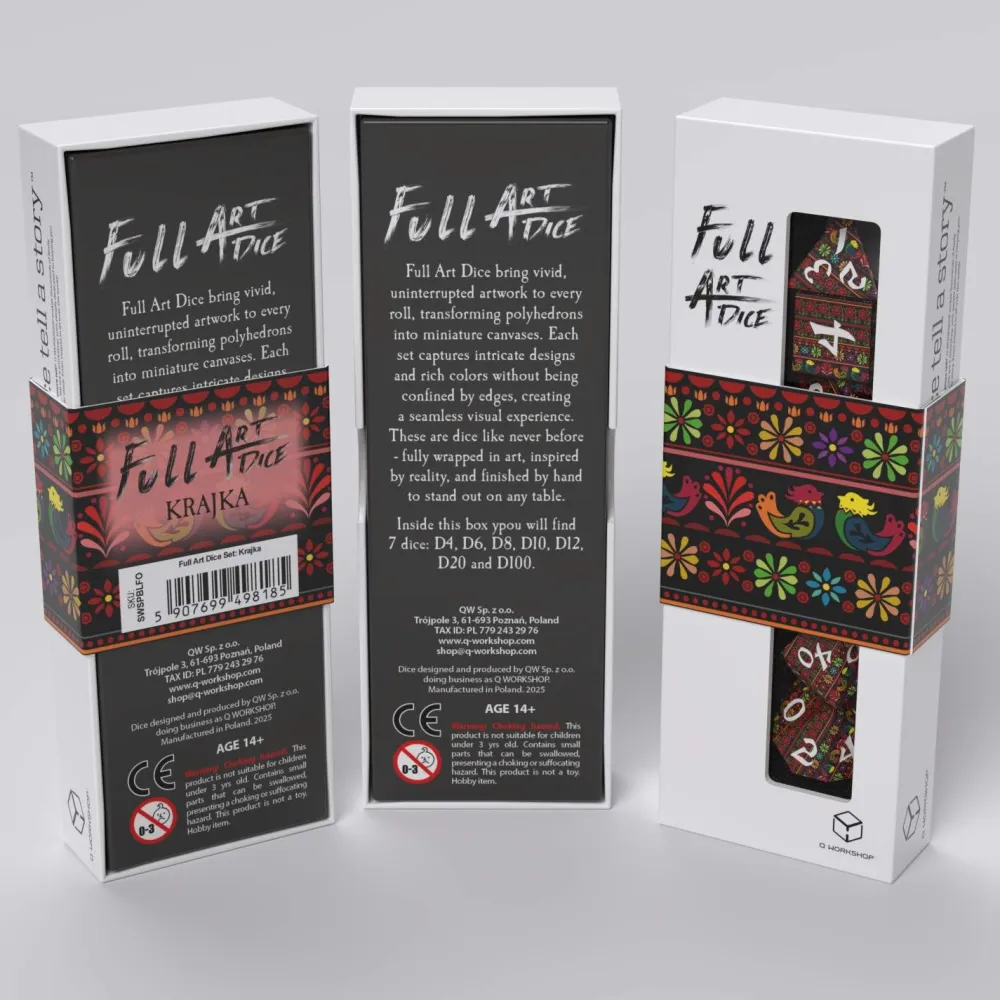 Step into the weave where folklore meets fantasy! We created this innovative set as a tribute to Polish craftsmanship — a tapestry of color and shape inspired by traditional handwoven belts and straps. Designed to break visual boundaries, these vivid, colorful dice are not limited by the edges. Each roll feels like touching the weft of history, binding the past and present in every roll of fate.
