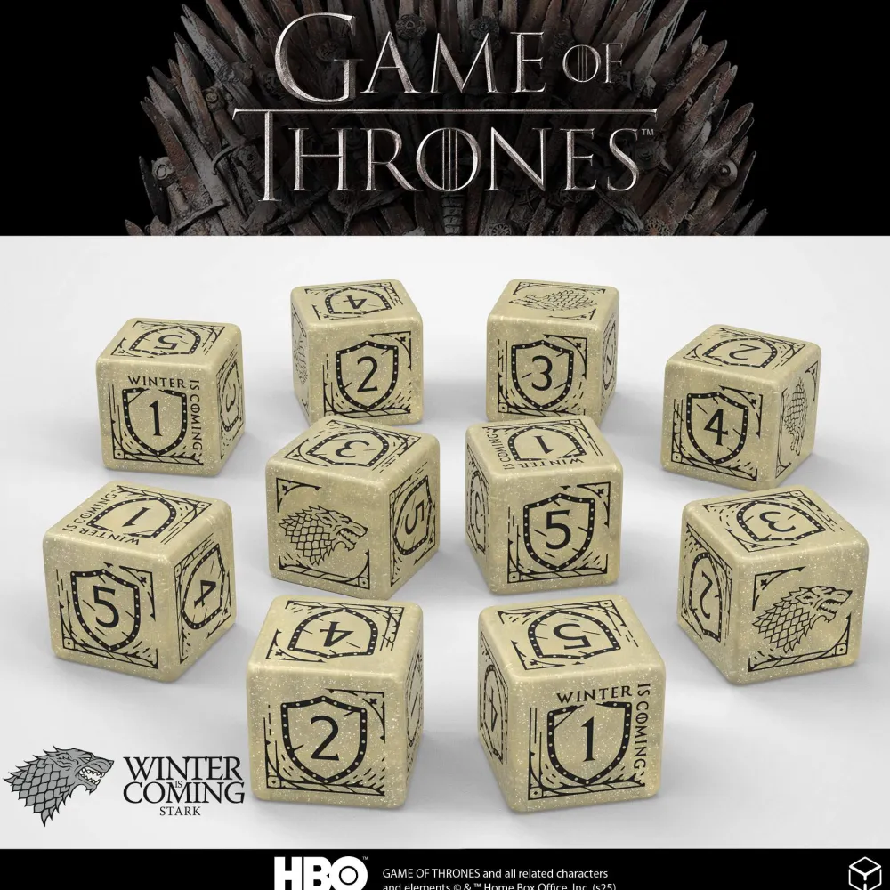 This officially licensed dice set reflects the iconic colors of House Stark, mirroring its banner with beige dice and deep black engravings. Each six-sided die features the direwolf sigil on the highest face and the house motto, «Winter is Coming,» on the lowest. A fitting tribute to the North, designed for those who value honor, resilience, and an unwavering sense of duty.