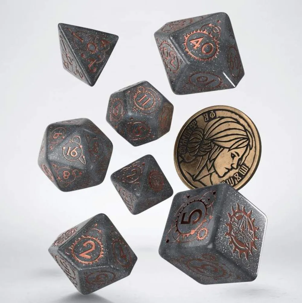 An heir to Lara Dorren. Inspired by The Witcher franchise, this dice set is dedicated to Cirilla Fiona Elen Riannon, a carrier of Elder Blood. The set contains 7 polyhedrons, and a metal coin featuring Ciri’s depiction. Each dice has white material with aquamarine engravings. The highest value faces, and coin reverse, are adorned with the School of Cat symbol.