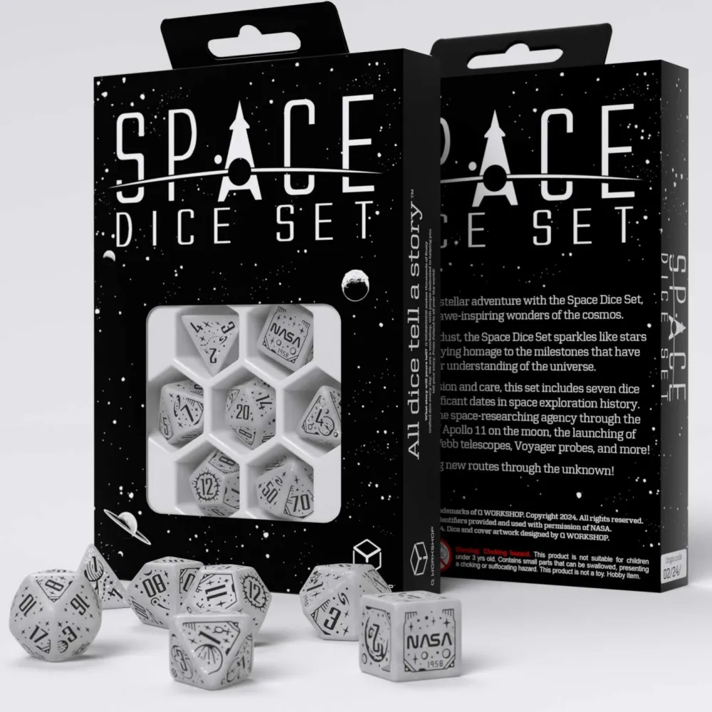 Closer to the starlight! Join us in commemorating the most significant achievements in human history. The Space Dice Set: Apollo features 7 unique polyhedrons showcasing motifs related to space exploration. The dice are white (infused with glitter dust), while the engravings are black. This is a wonderful gift for any sci-fi-loving RPG player or a fan of astronomy and science.