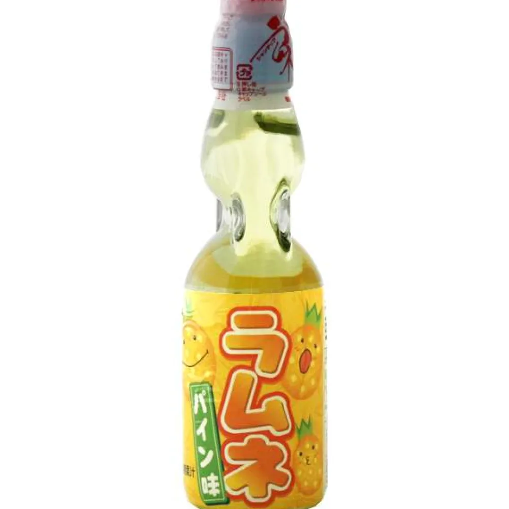 Japansk Karbonert Brus Ananas smak 200 mlHata-Kosen Pineapple Ramune SodaIngredienser: karbonholdig vann, fruktoseglukosesyrup, surhetsregulerende middel, smakstilsetning, fargestoff (gul). Næringsinnhold (per100ml): Energi: 154KJ/ 37kcal, fett: 0g hvorav mettet: 0g, karbohydrater: 9,3g hvorav sukkerarter: 8,2g, proteiner: 0g, salt: 0gProdusert i Japan