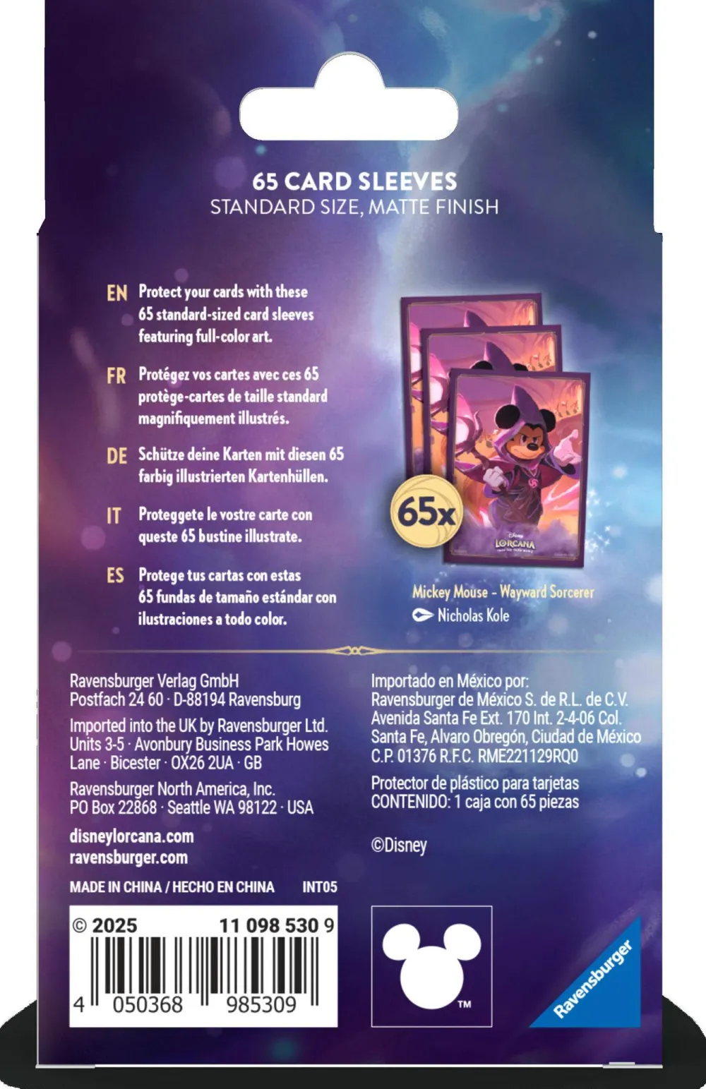 Protect cards from wear and tear during play with card sleeves featuring card art of Mickey Mouse – Wayward Sorcerer and Enchanted card art of Tinker Bell – Giant Fairy. Each pack includes 65 matte-finish Card Sleeves.
