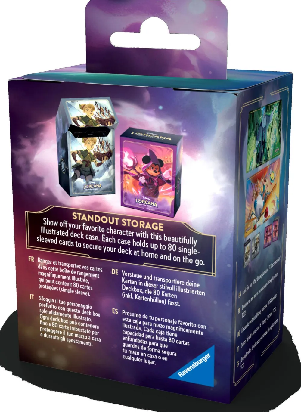Keep decks organized and protected with deck cases featuring card art of Mickey Mouse – Wayward Sorcerer and Enchanted card art of Tinker Bell – Giant Fairy. Each Deck Case can hold up to 80 sleeved cards.