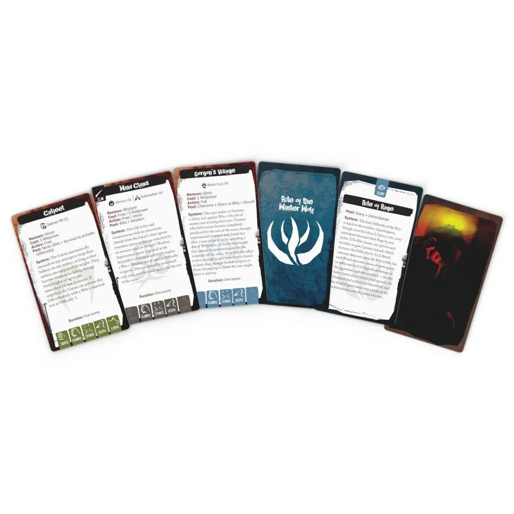 The spirits grant potent Gifts the Garou placate the spirits with powerful Rites. Both sides may be unwilling allies in the struggle to survive the Apocalypse and combat the Wyrm. This Gift and Rite Deck contains each of the Gifts and Rites found in the core rules for Werewolf: The Apocalypse plus the Storyteller’s Toolkit and Shattered Nation. Each Gift and Rite is presented on a standard Tarot-sized card for ease of use at the table.