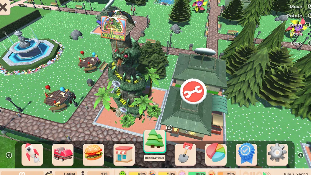 - Landscaping: get super detailed with the design of your paths, add flowers, bushes and trees foliage, and cool water features throughout your park.