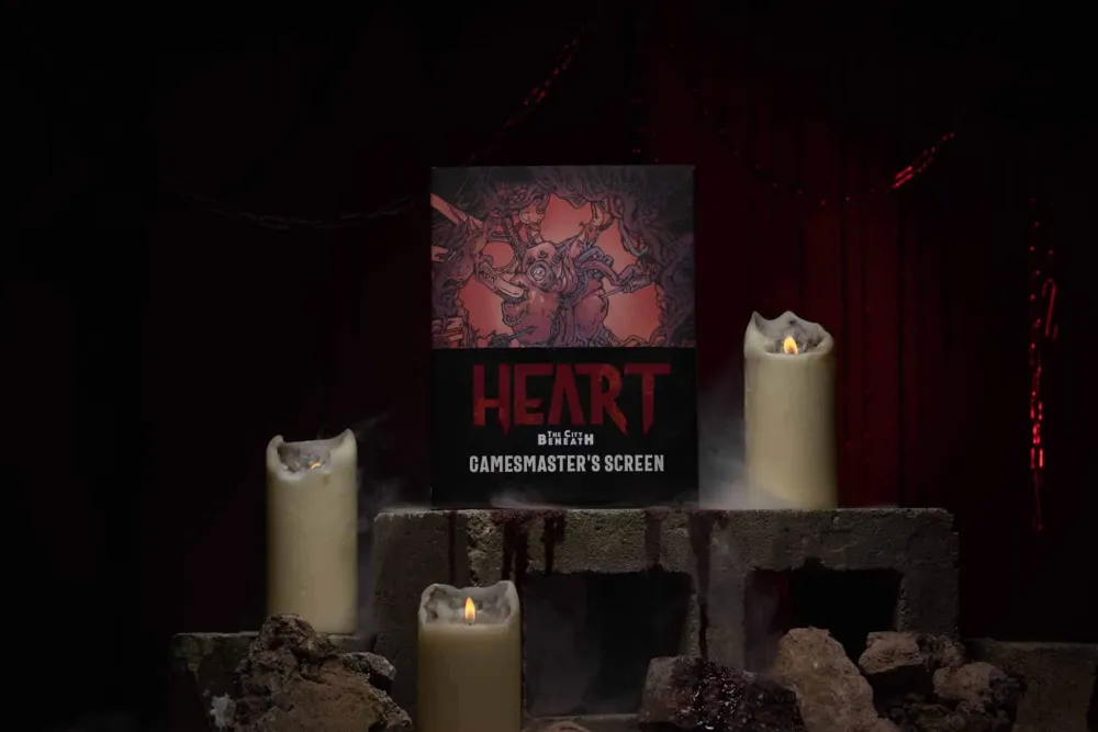 - Three panel landscape GM screen measuring 216mm × 897 mm and illustrated by Sar Cousins that serves as a gorgeous setpiece to immerse players and GMs in the world of Heart.