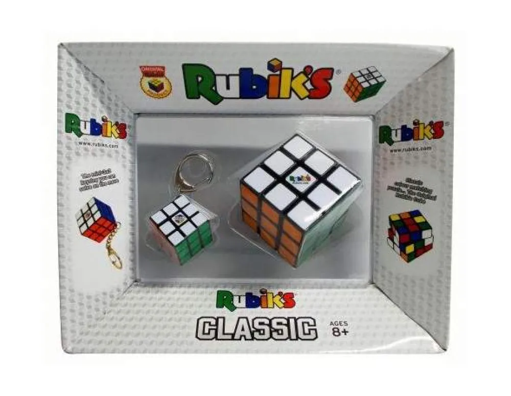 Det medfølger også en nøkkelring med en miniutgave av Rubiks kube. Den er også med 3 x 3 felter og måler 3 cm på alle sider.