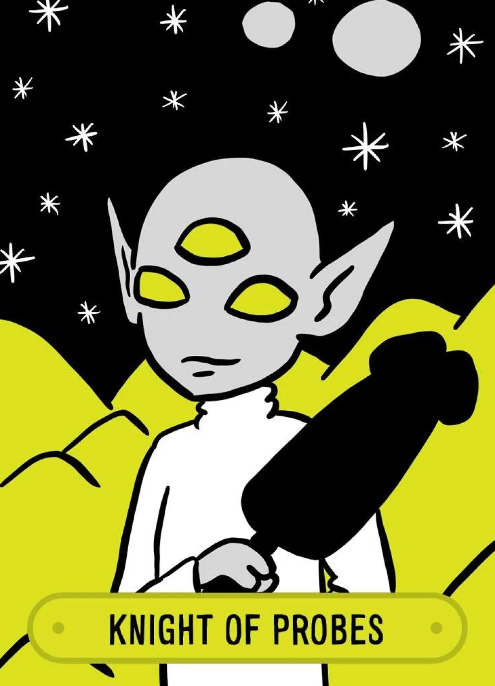 Full of alien probes, ray guns, test tubes, and UFOs, this deck follows the traditional 78-card structure, with some small, mischievous changes. The suits have been swapped out to include ray guns, specimens, disks, and probes.