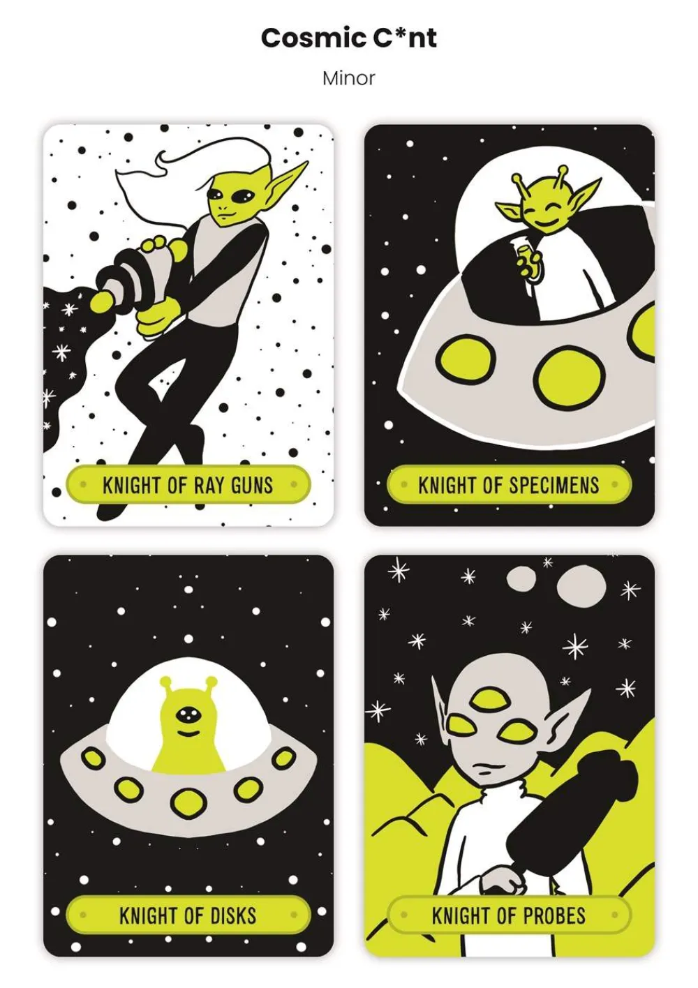 The Cosmic C*nt Tarot is a tongue-in-cheek, fun, pocket-sized tarot deck designed for the alien-loving reader.