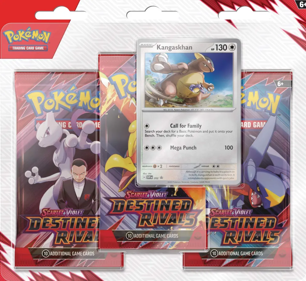 Contains 3 booster packs from Pokémon TCG: Scarlet & Violet—Destined Rivals. (Each booster pack contains 10 game cards and 1 Basic Energy. Cards vary by pack.)