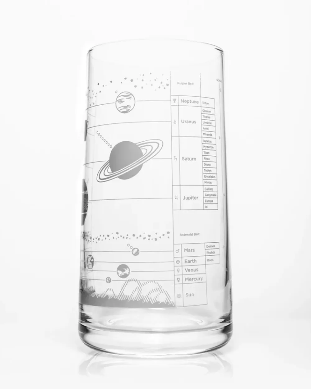Fill with ice up to Jupiter then top it up to the Kuiper belt with iced tea or your favorite fizzy drink. Muse on interplanetary exploration or let your mind winder out into the void with this Solar System drinking glass.