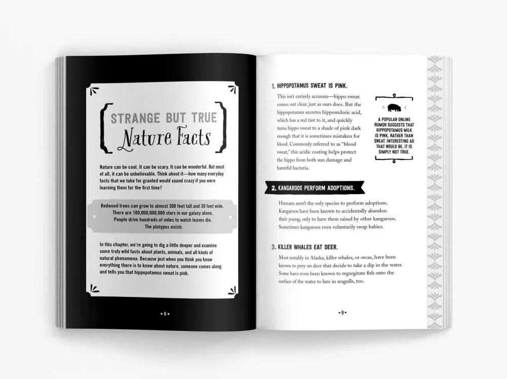 With over 500 outrageous and real facts on everything from hippo sweat to stars in the galaxy, you’re sure to impress your friends, stump your colleagues, and crush the trivia night competition! Discover insane-but-true factoids and prove you really do know it all! Test out the True or False questions covering the gamut of science, sports, history, pop culture, and a potpourri of others, like: