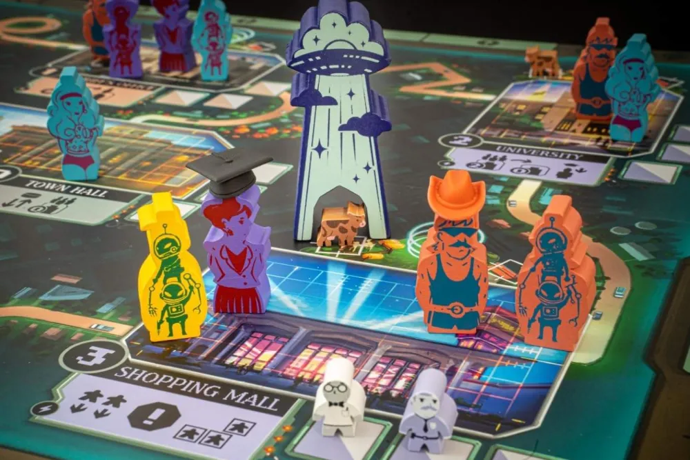 HOW TO PLAY – Reposition your alien figures across key town locations to compete for majority influence. Activate an event card that benefits the players with the most influence.