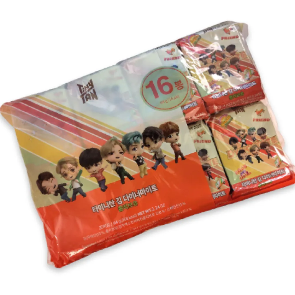 Tiny TAN krydret sjøgress snacks med Olivenolje. Hver pakke inneholder også søte klistremerker med BTS TinyTan karakterene.