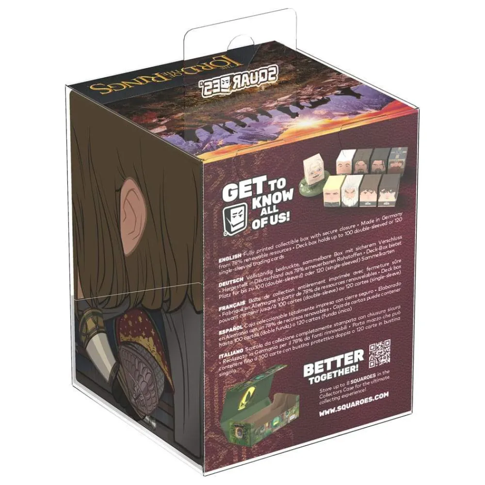 Collectible box for storing TCG decks, tabletop gaming accessories, and/or collectibles. The Boromir Squaroe from the The Lord of the Rings edition holds up to 100 cards in double protective sleeves if used as a deck box. Squaroes are made from 78% renewable resources and fit perfectly into the separately available Collectors Case.