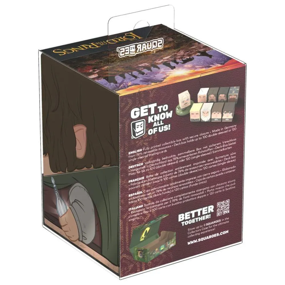 Collectible box for storing TCG decks, tabletop gaming accessories, and/or collectibles. The Frodo Squaroe from the The Lord of the Rings edition holds up to 100 cards in double protective sleeves if used as a deck box. Squaroes are made from 78% renewable resources and fit perfectly into the separately available Collectors Case.