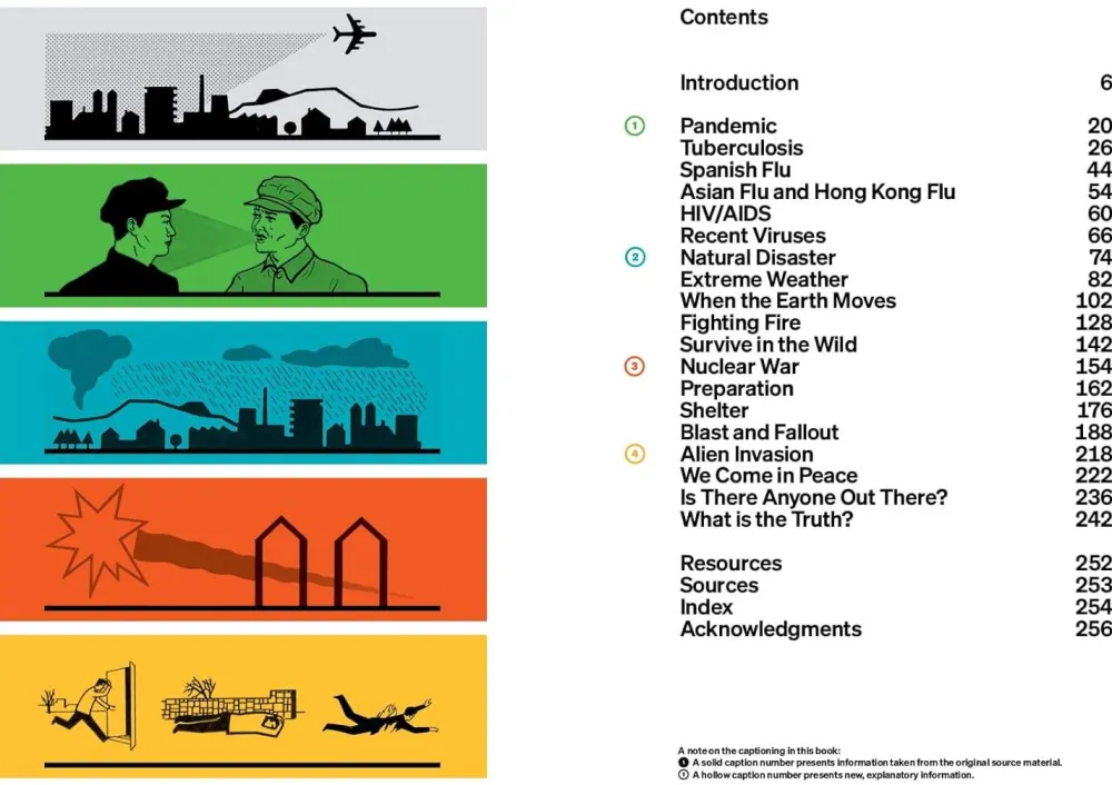 Organized into four broad disaster-themed scenarios – Pandemics, Natural Disasters, Nuclear War and Alien Invasion – this visual guide displays the plethora of public survival advice and scare tactics proposed from all around the globe to deal with every disaster scenario that has occurred or been imagined since the early 20th century. From leaflets showing how to build an earthquake shelter to booklets providing step-by-step advice on how to protect yourself and your family during a nuclear war, and from posters showing how to minimize your chances of catching Spanish flu to documents indicating how to identify aliens, this carefully curated selection of disaster-planning documents reveals differences in public attitudes towards impending catastrophe since the 1910s and showcases the variety of approaches taken by governments in advising their citizens. Informative commentary provides historical context for the official advice, exploring how our universal preoccupation with apocalypse has manifested around the globe, and explanatory captions clarify the messages contained in the survival documents.